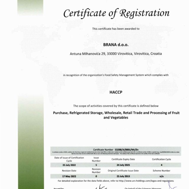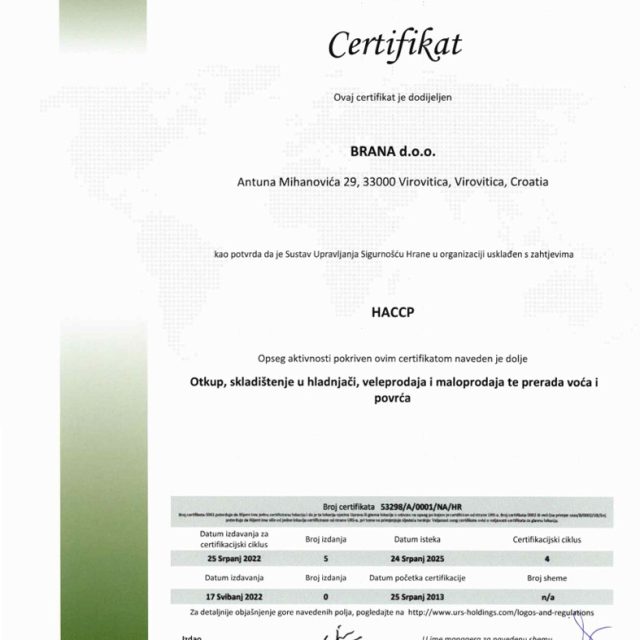 Certifikat je potvrda da je sustav upravljanja sigurnošću hrane usklađen sa zahtjevima HACCP. Opseg aktivnosti koji je pokriven ovim certifikatom: otkup, skladištenje u hladnjači, veleprodaja i maloprodaja te prerada voća i povrća.