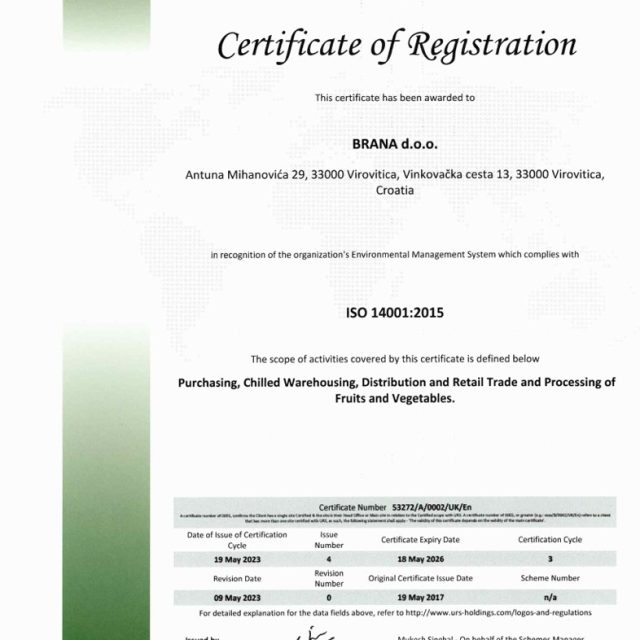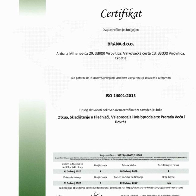 Certifikat ISO 14001:2015 za sljedeći opseg aktivnosti: otkup, skladištenje u hladnjači, veleprodaja i maloprodaja te prerada voća i povrća.