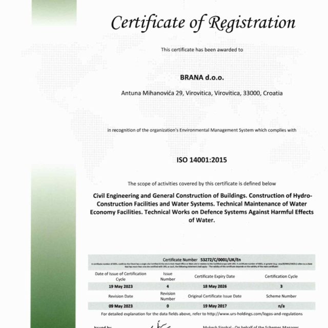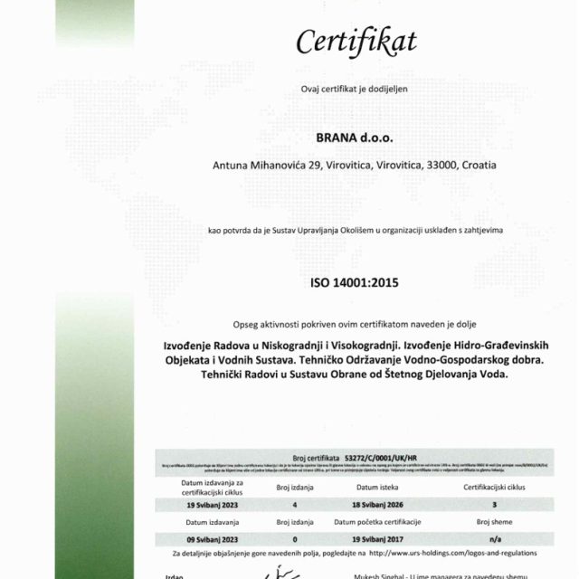 Certifikat ISO 14001:2015 za sljedeći opseg aktivnosti: izvođenje radova u niskogradnji i visokogradnji. Izvođenje hidro-građevinskih objekata i vodnih sustava. Tehničko održavanje vodno-gospodarskog dobra. Tehnički radovi u sustavu obrane od štetnog djelovanja voda.