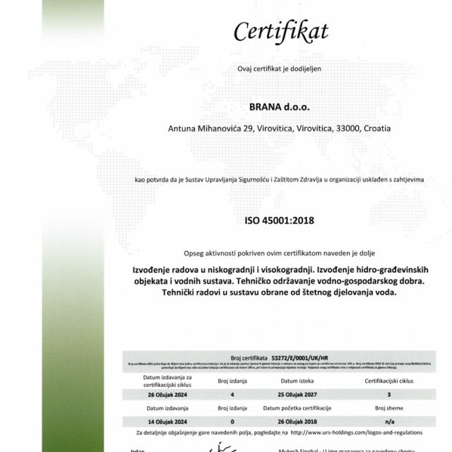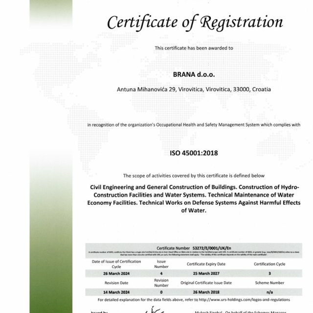 Certifikat ISO 45001:2018 za sljedeći opseg aktivnosti: izvođenje radova u niskogradnji i visokogradnji, izvođenje hidro-građevinskih objekata i vodnih sustava. Tehničko održavanje vodno-gospodarskog dobra. Tehnički radovi u sustavu obrane od štetnog djelovanja voda.