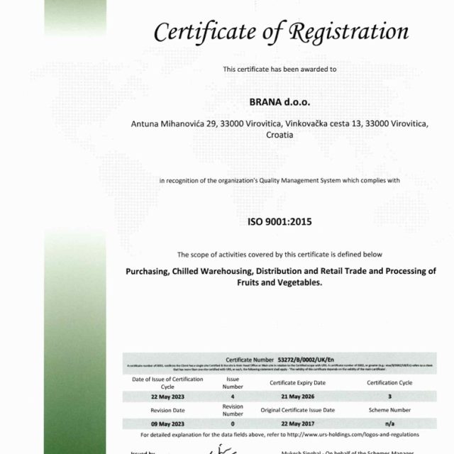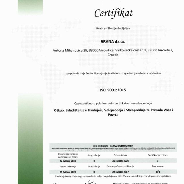 Certifikat ISO 9001:2015 za sljedeći opseg aktivnosti: otkup, skladištenje u hladnjači, veleprodaja i maloprodaja te prerada voća i povrća.