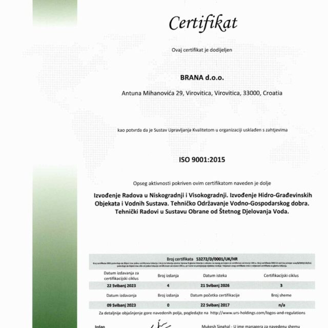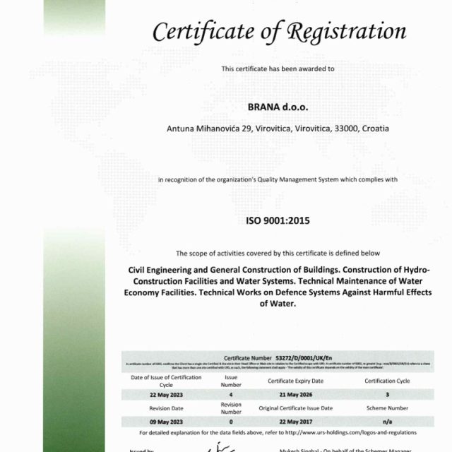 Certifikat ISO 9001:2015 za sljedeći opseg aktivnosti: izvođenje radova u niskogradnji i visokogradnji, izvođenje hidro-građevinskih objekata i vodnih sustava. Tehničko održavanje vodno-gospodarskog dobra. Tehnički radovi u sustavu obrane od štetnog djelovanja voda.